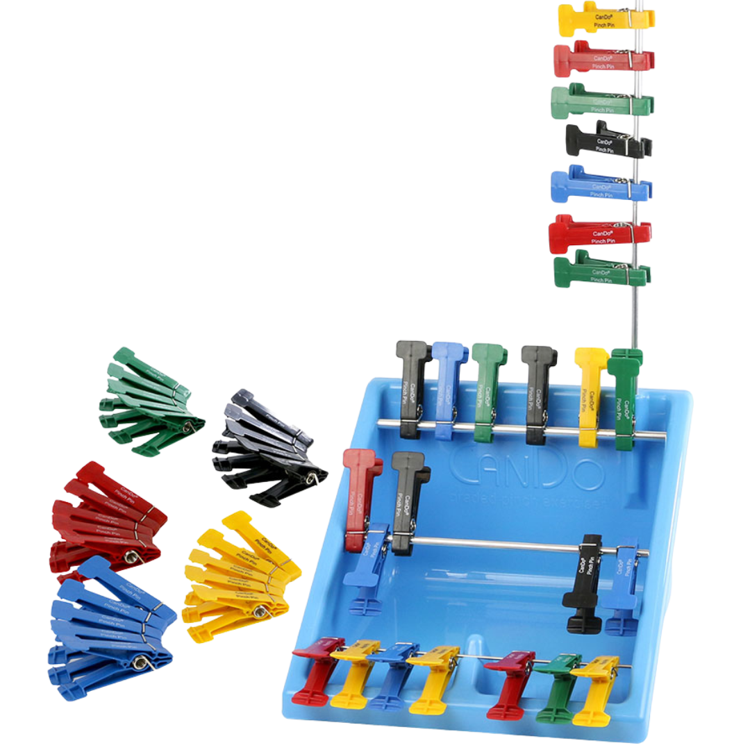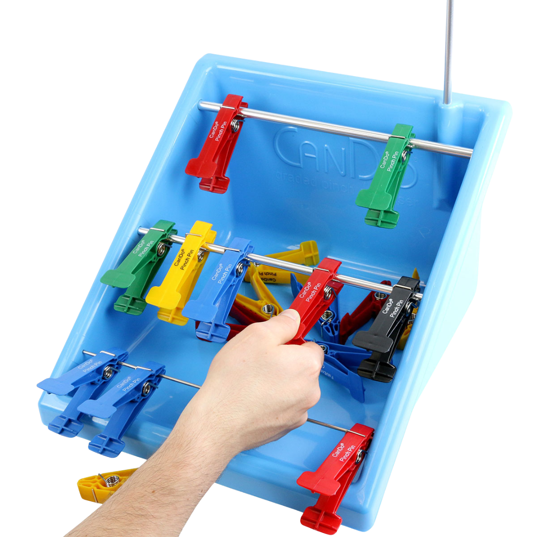 El ejercitador de dedos de pellizco graduado CanDo está diseñado para desarrollar la fuerza de las manos y los dedos. Utilizado por pacientes que se recuperan de lesiones en la mano o personas con discapacidades. Utilizan los ejercitadores y las varillas de varias maneras para ayudar a mejorar la destreza, la fuerza de agarre y la coordinación motora fina. Este conjunto completo es ideal para una variedad de aplicaciones